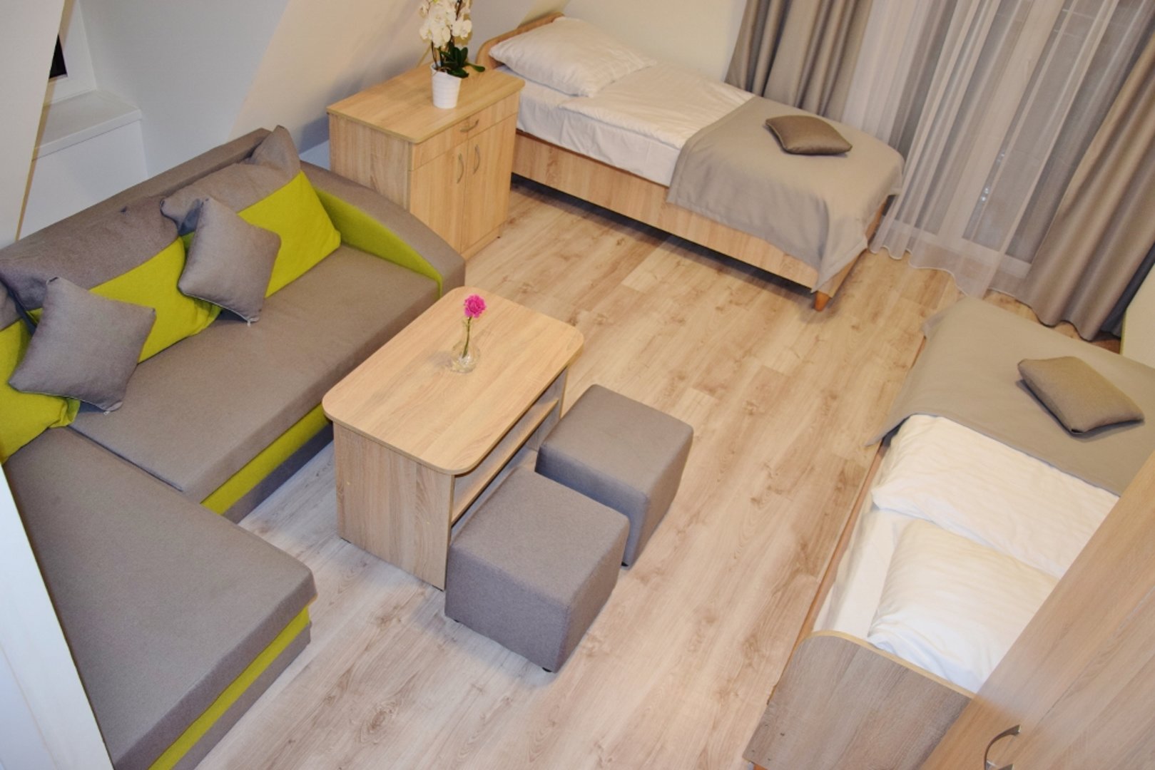 Pokój 4-osobowy z łazienką, balkonem i w pełni wyposażonym aneksem kuchennym (czajnik elektryczny, garnki, patelnia, sztućce, szklanki talerze, płyta grzejna). W pokoju znajdują się 3 łóżka hotelowe + rozkładany narożnik (2os.).