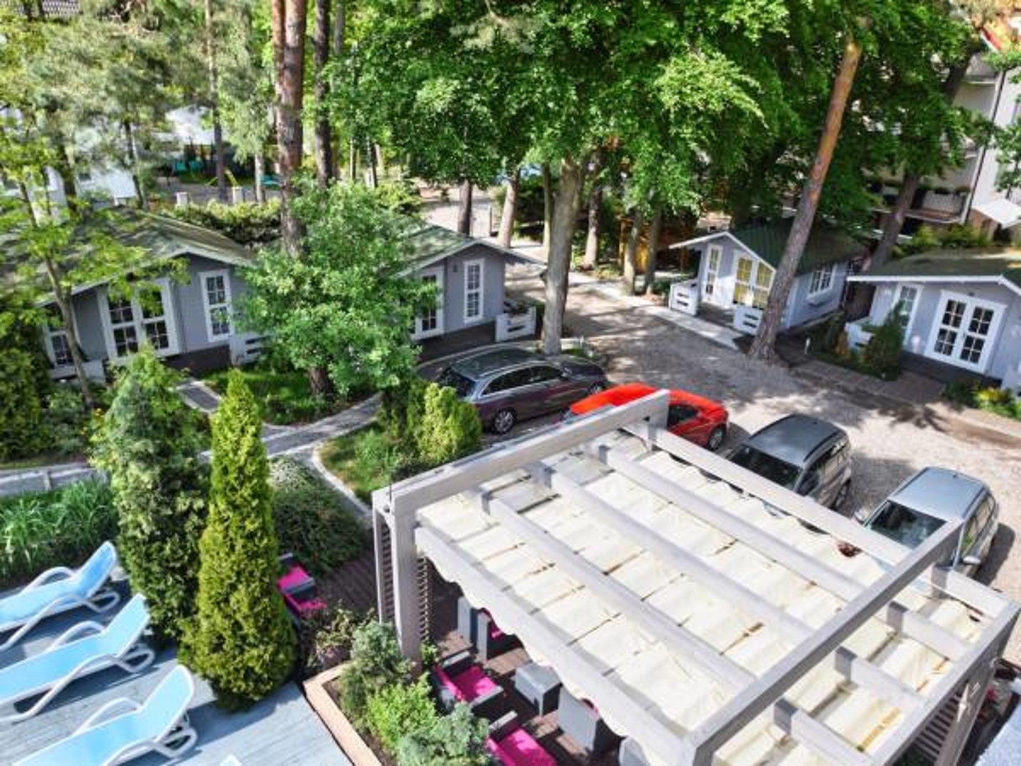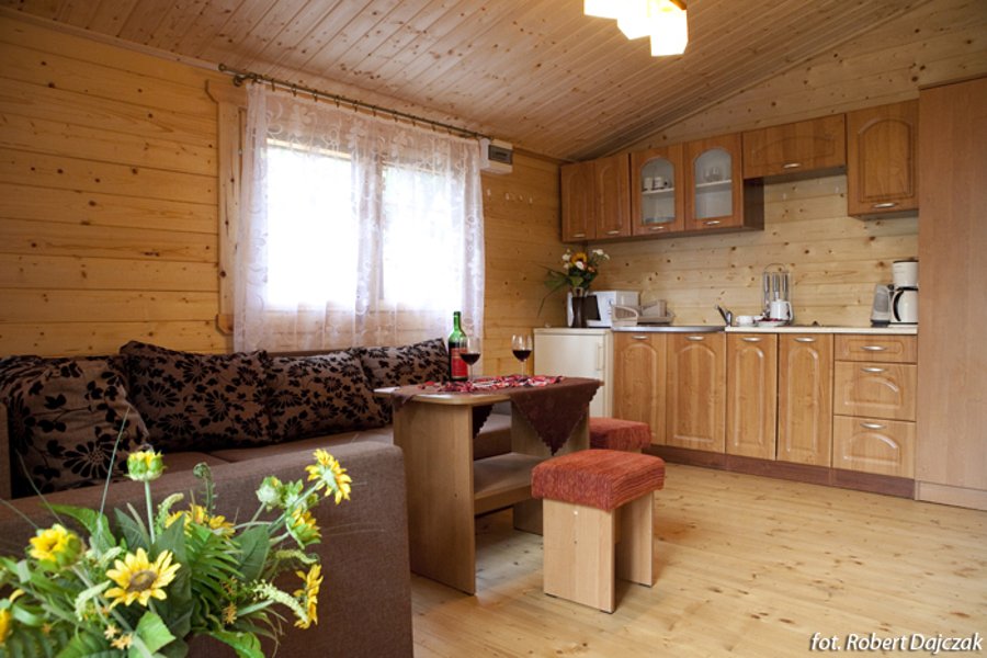 Domek drewniany dla 4 osób o powierzchni 30m2 Pokój gościnny z rozkładanym narożnikiem dla 2 osób i aneksem kuchennym w pełni wyposażonym oraz łazienka. Taras z meblami ogrodowymi.