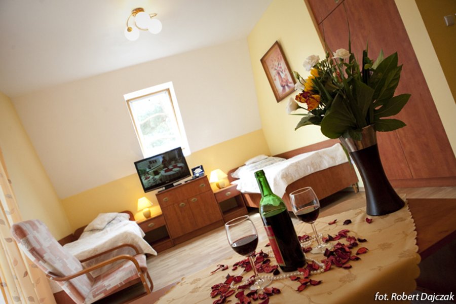 Pokój 3/4 osobowy z łazienką, balkonem i w pełni wyposażonym aneksem kuchennym (czajnik elektryczny, garnki, patelnia, sztućce, szklanki talerze, płyta grzejna). W pokoju znajdują się 3 łóżka hotelowe + rozkładany narożnik (2 os.)